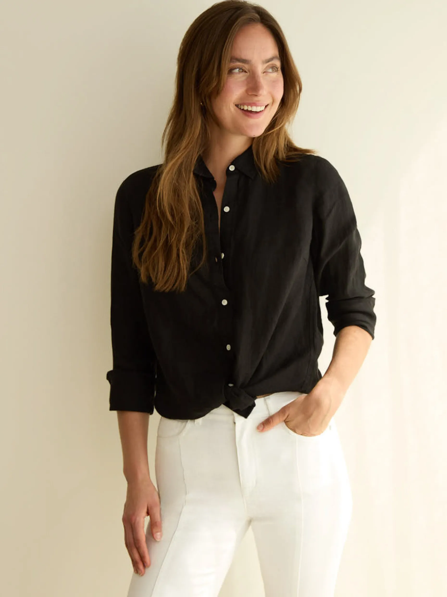 Scoop up our airy linen shirt with a high-low hem and slightly more relaxed fit. We feel a bit more loosened up just looking at it.