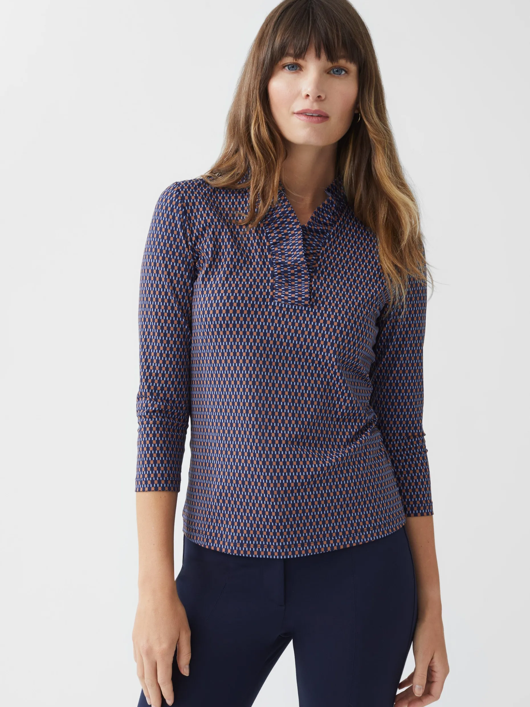 Our top stands out with a face-framing ruffled neckline and comes in our most packable fabric.