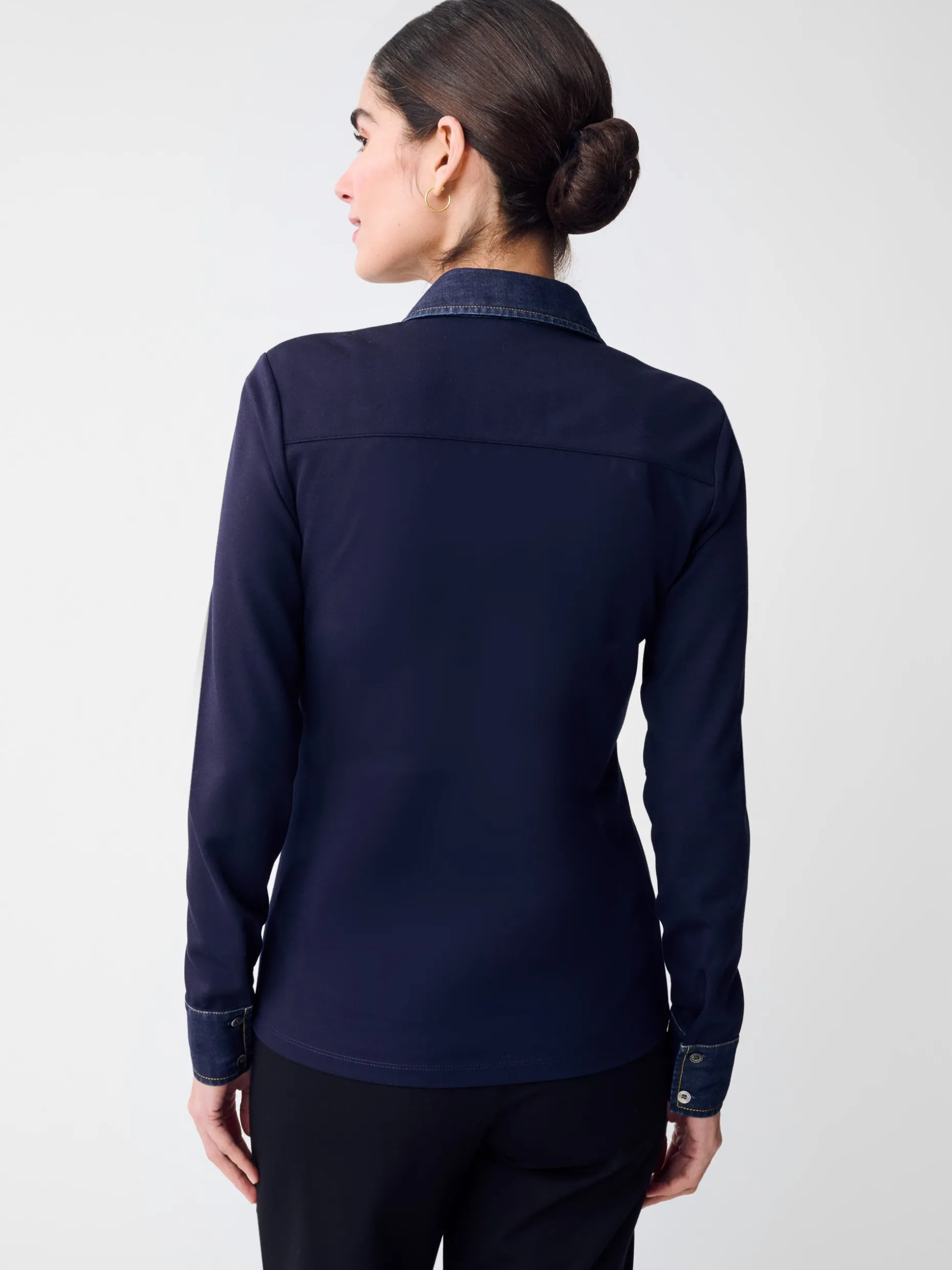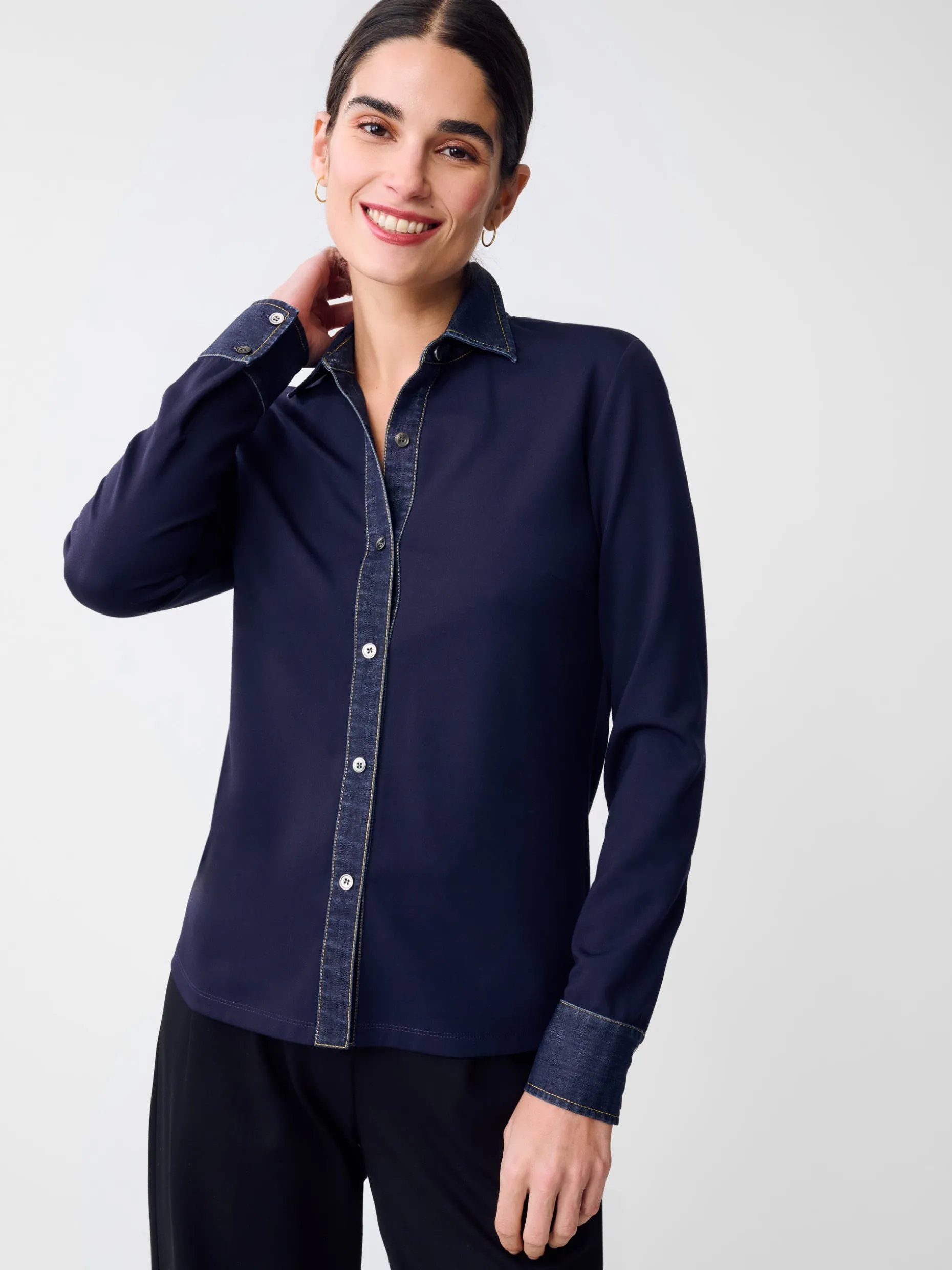 A twist on the classic button-down shirt, the Joyann is crafted in our signature Bainbridge Cloth with pops of denim on the collar, cuffs, and placket.