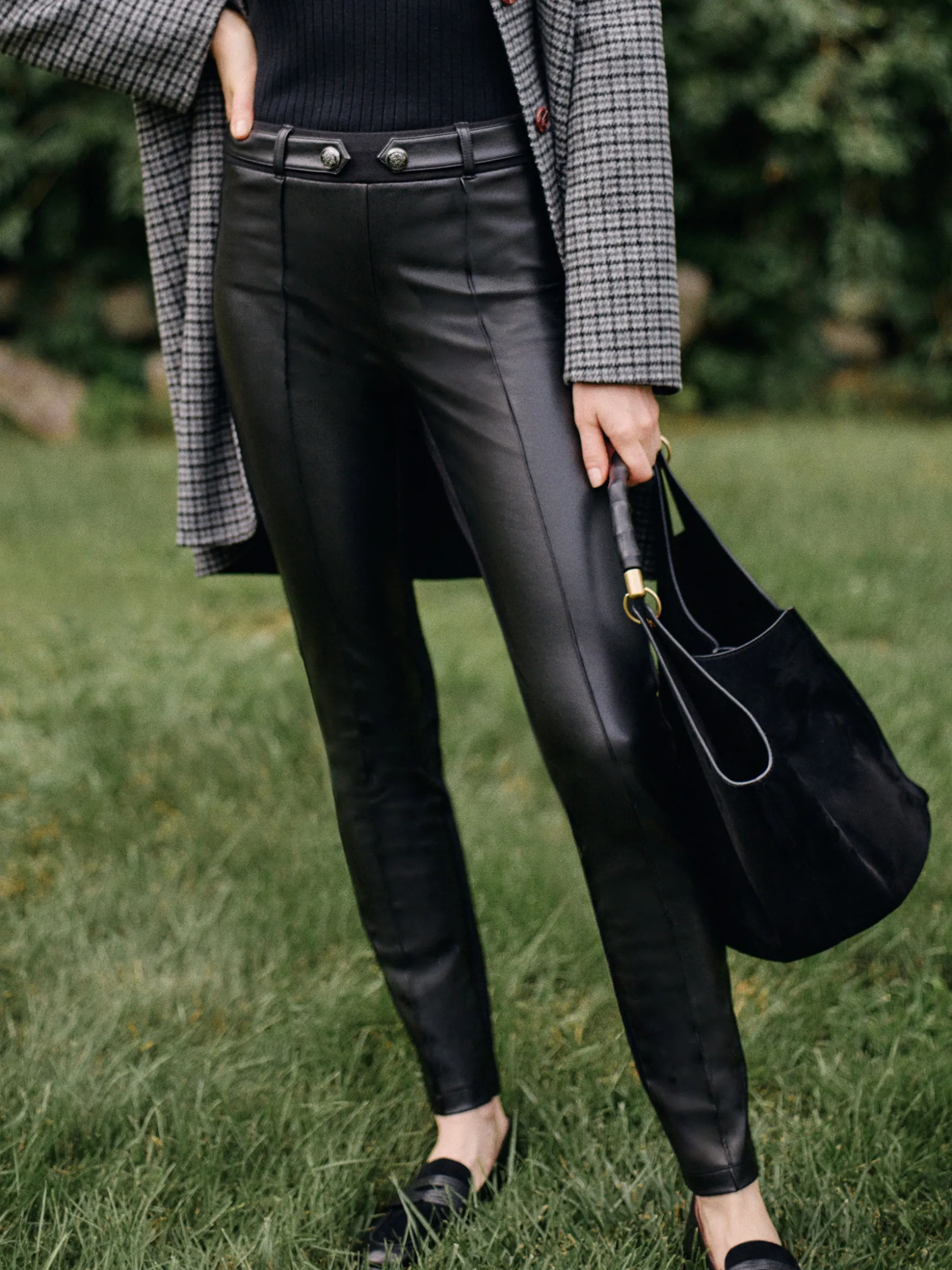 A statement pant with softness and stretch: the Jules legging, featuring pintucked faux-leather at the front, with our matte Bainbridge Cloth at the back.