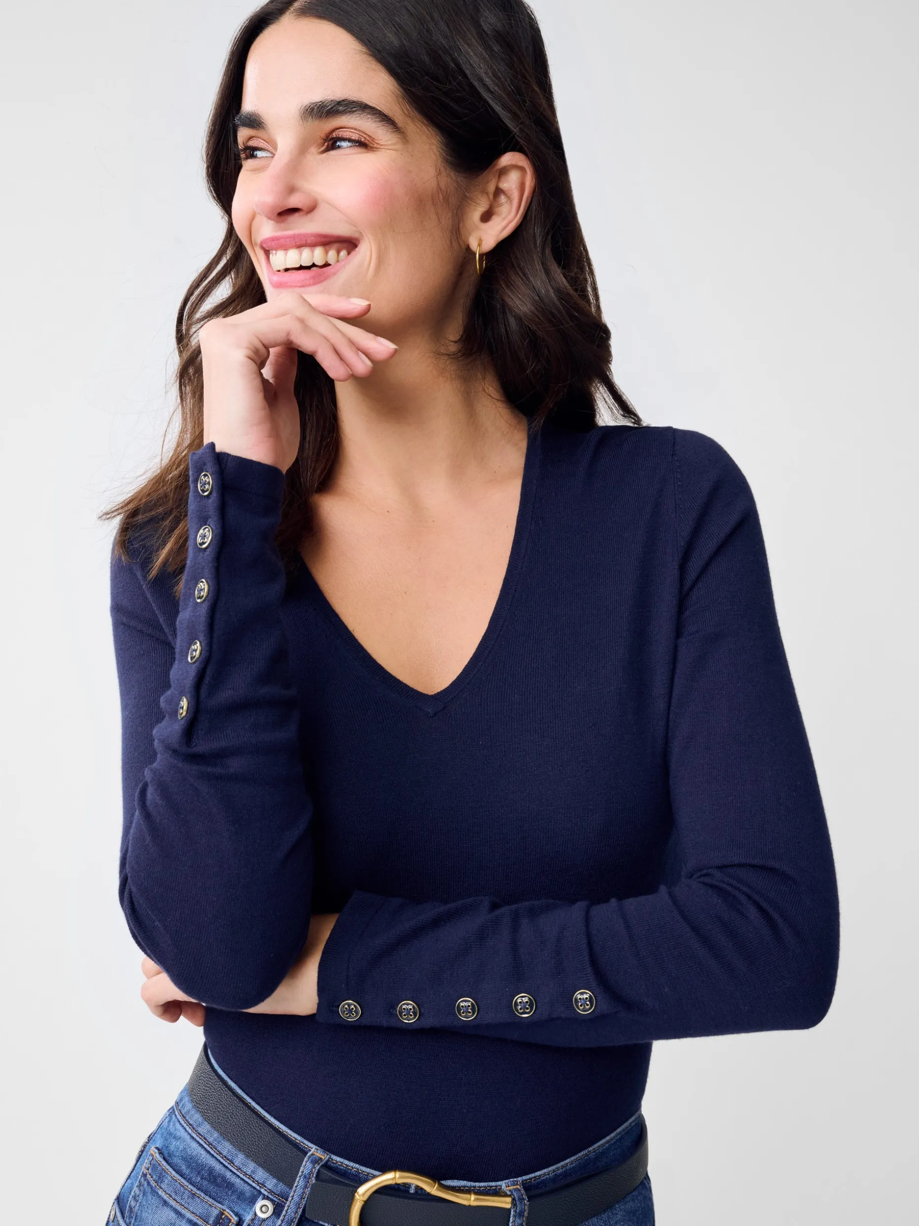 An update to our fan-favorite Jamey sweater, now in a V-neck silhouette with its signature tonal buttons along the sleeves.