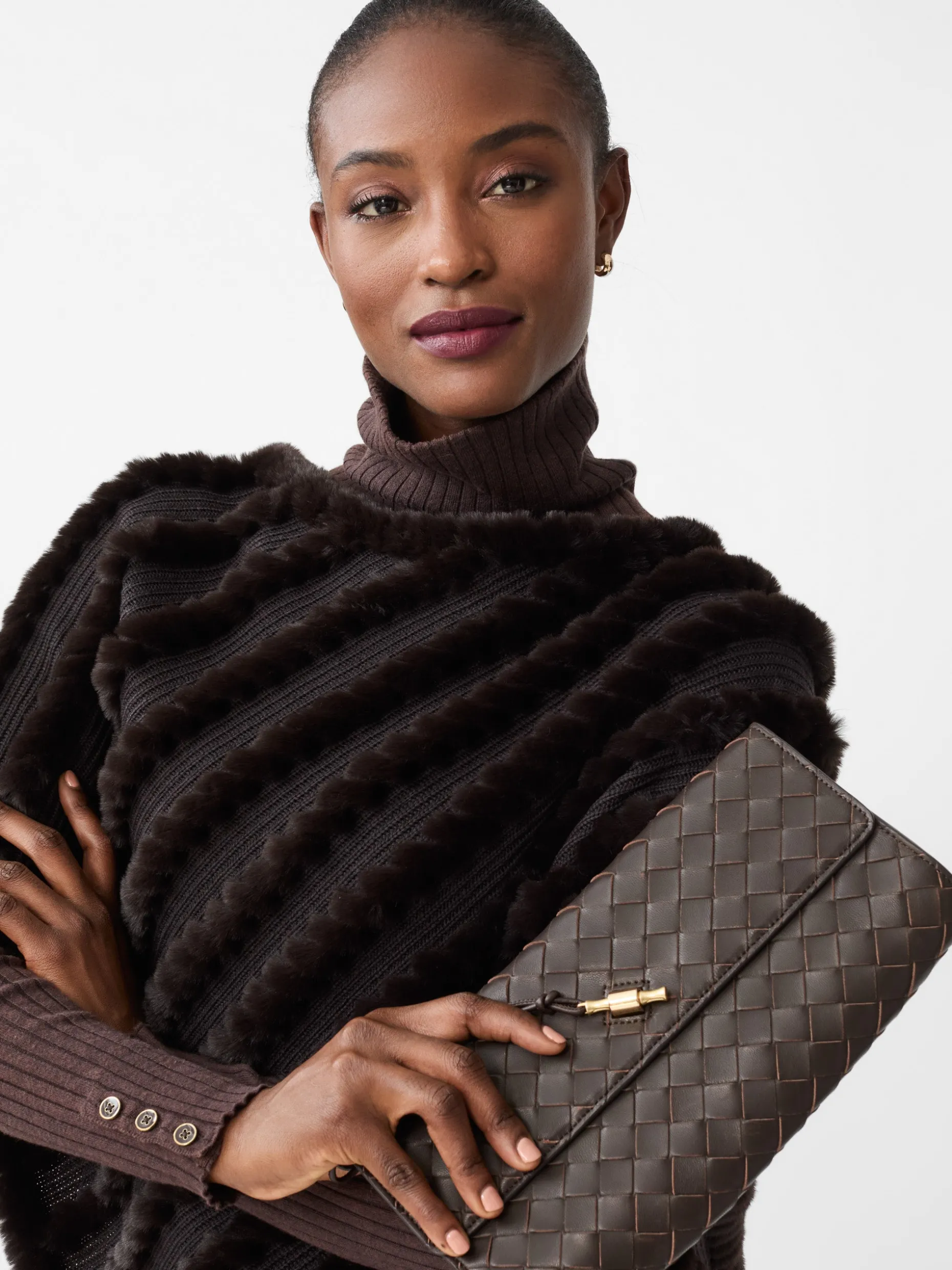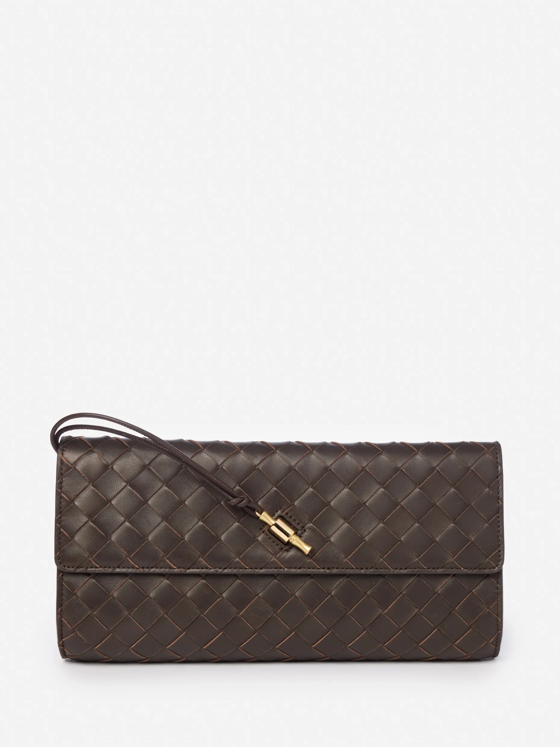 Designed in rich woven leather, the Pernille puts a unique spin on the evening-ready clutch with an asymmetric, bamboo-style closure.