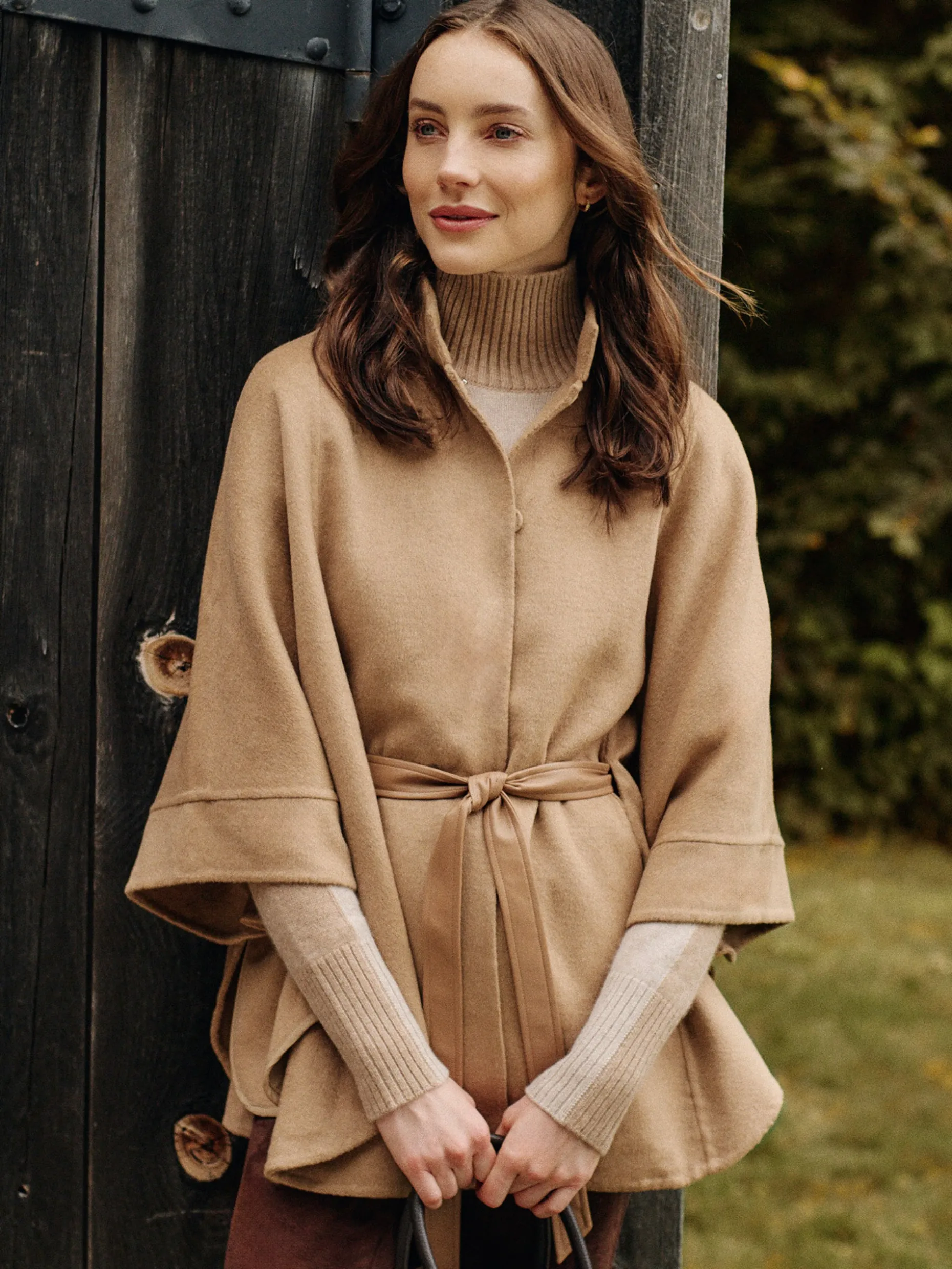 High fall. Crafted for elevated luxury and everyday ease, our wool blend poncho is a modern take on the top layer with a stand collar, snap button closures, and vegan leather tie belt.
