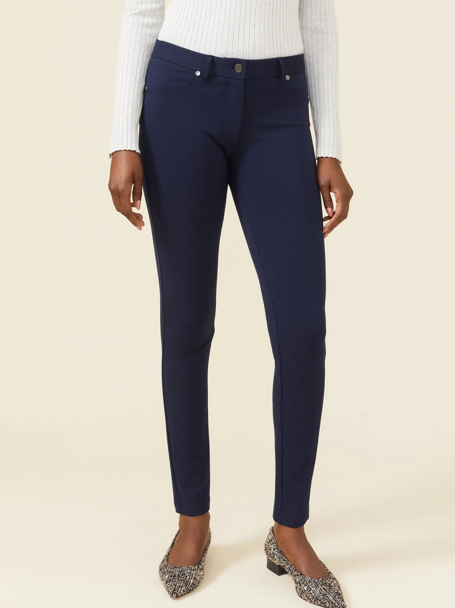 Meet a best-of-both worlds type of pant. We’ve achieved the comfy fit and silhouette of a legging with the structure and detailing of a tailored pant. This is the pair to wear with all the tops in your closet, from button downs to tunics.
