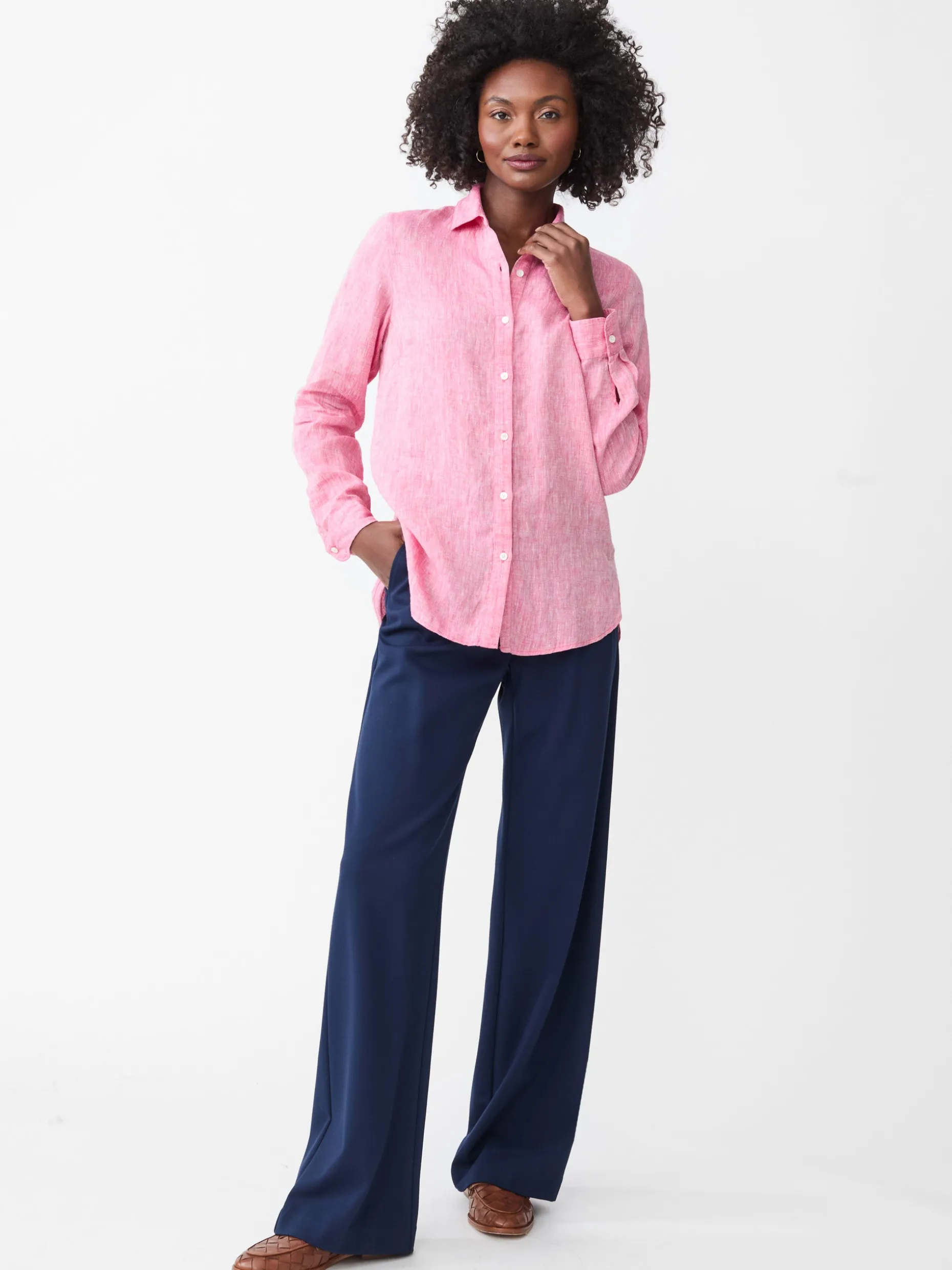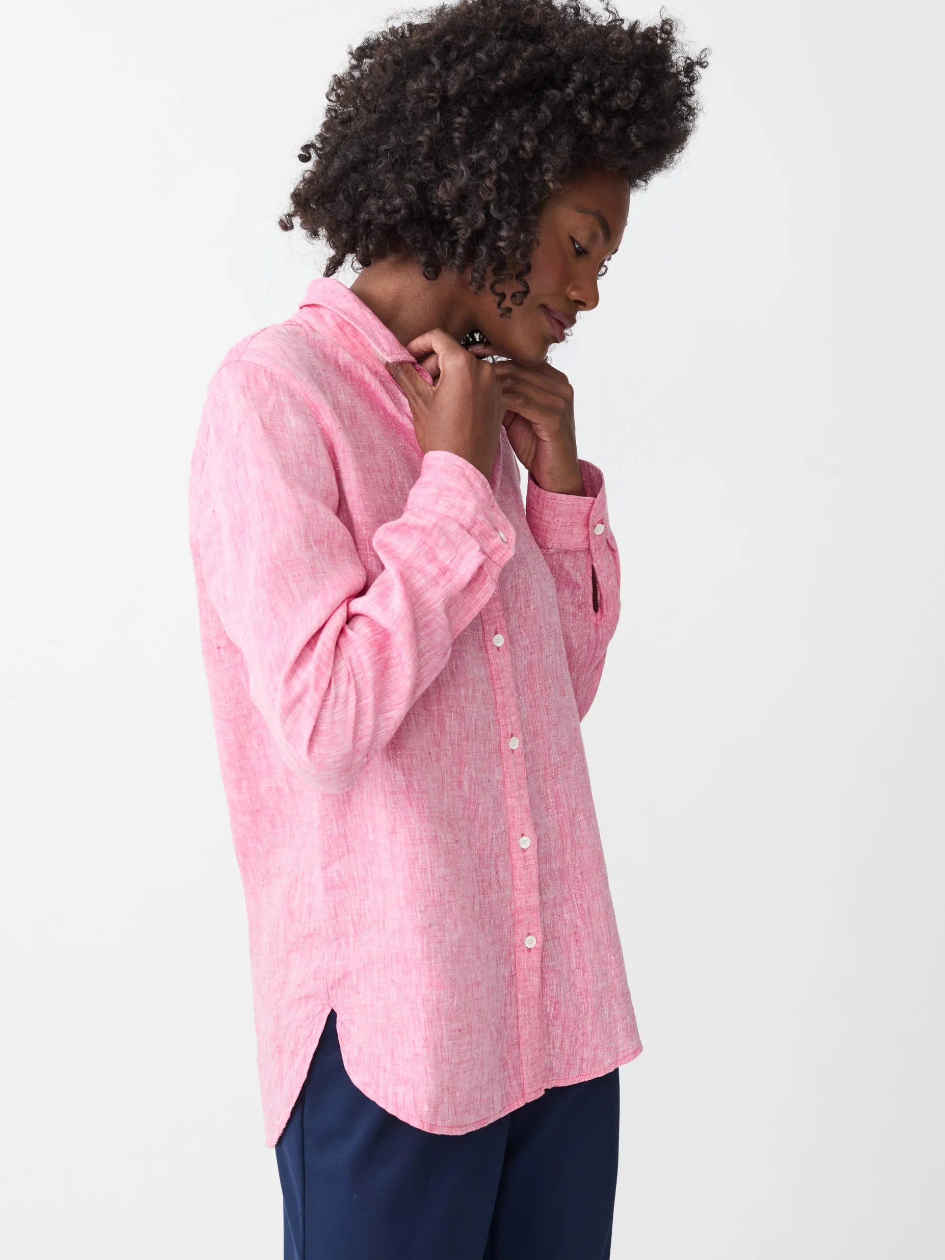 Scoop up our airy linen shirt with a high-low hem and slightly more relaxed fit. We feel a bit more loosened up just looking at it.