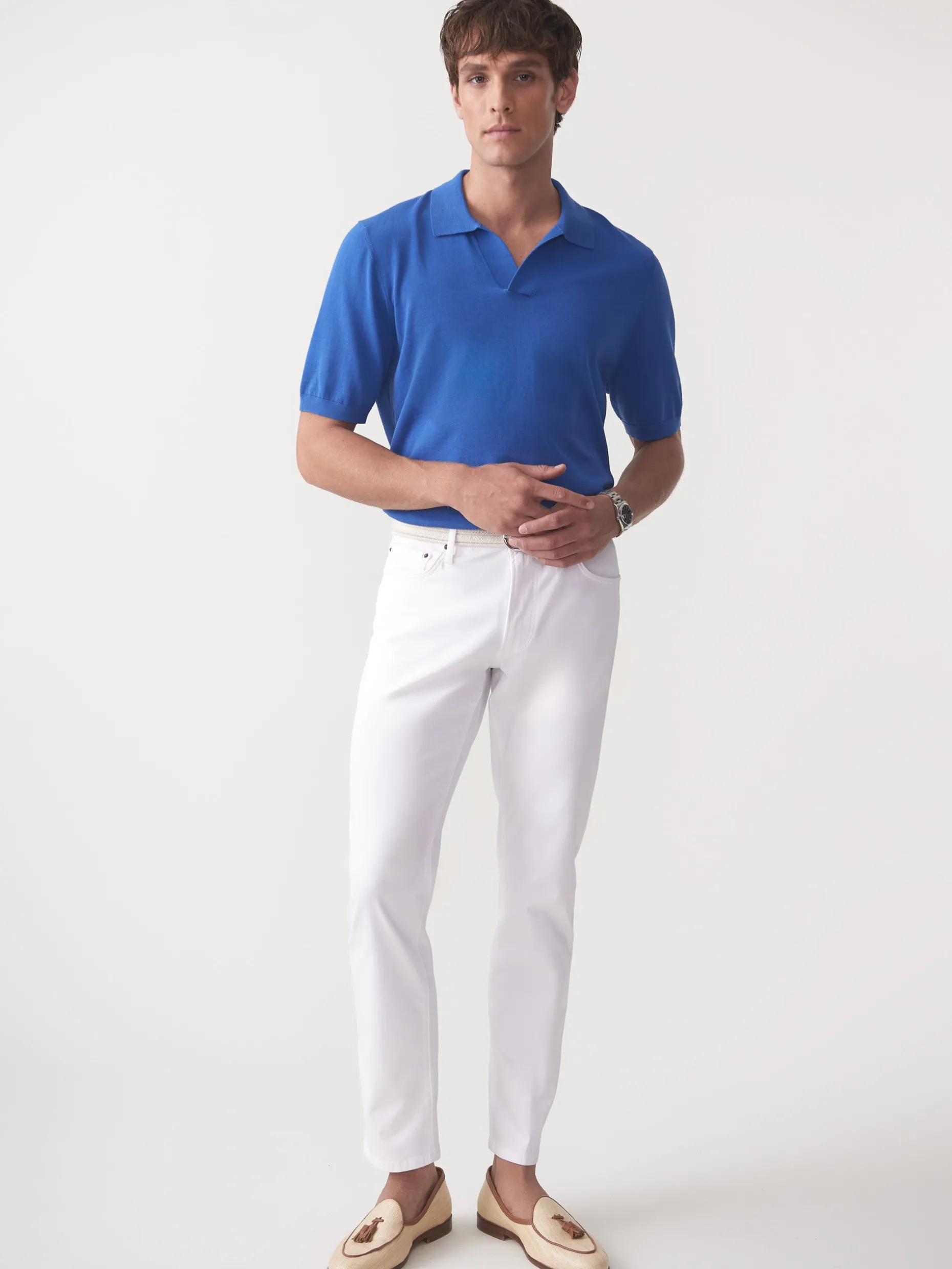A refined take on a polo shirt, ours features a no-button placket and ribbed sleeves and hem for a more polished look. With its Mediterranean flair, this piece pairs perfectly with an unstructured linen jacket and chinos or 5-pockets.