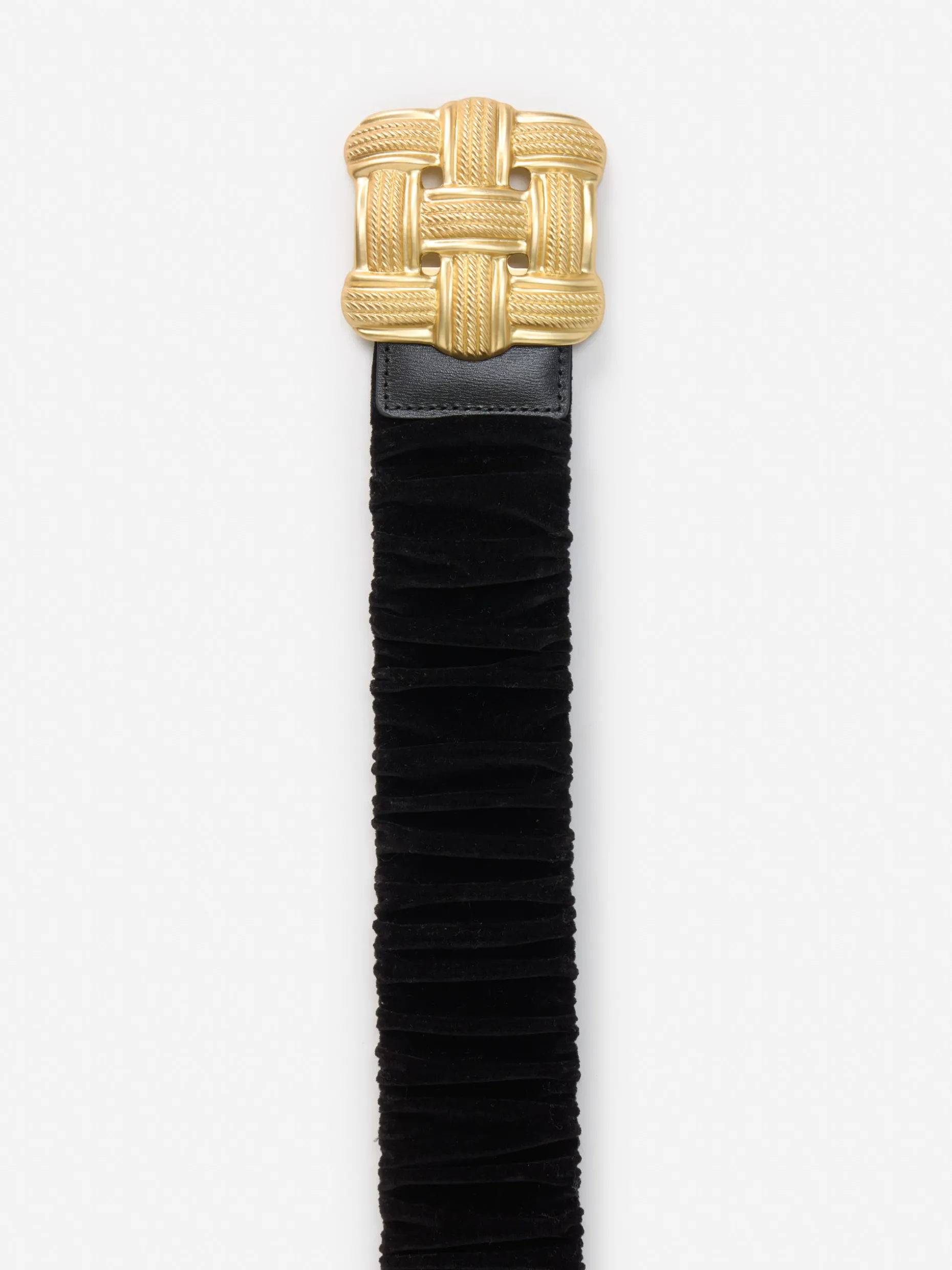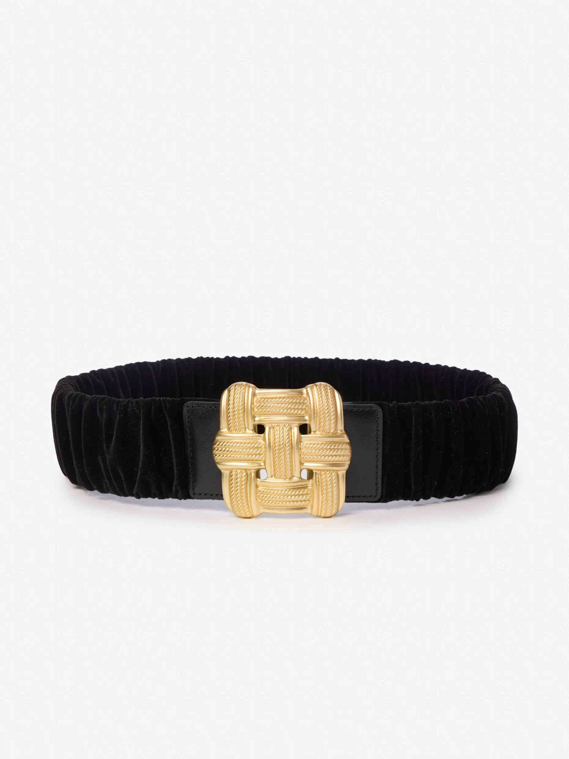 The accessory designed to be front and center: the Daisy belt, crafted in ruched velvet and finished with lattice-style gold tone buckle.