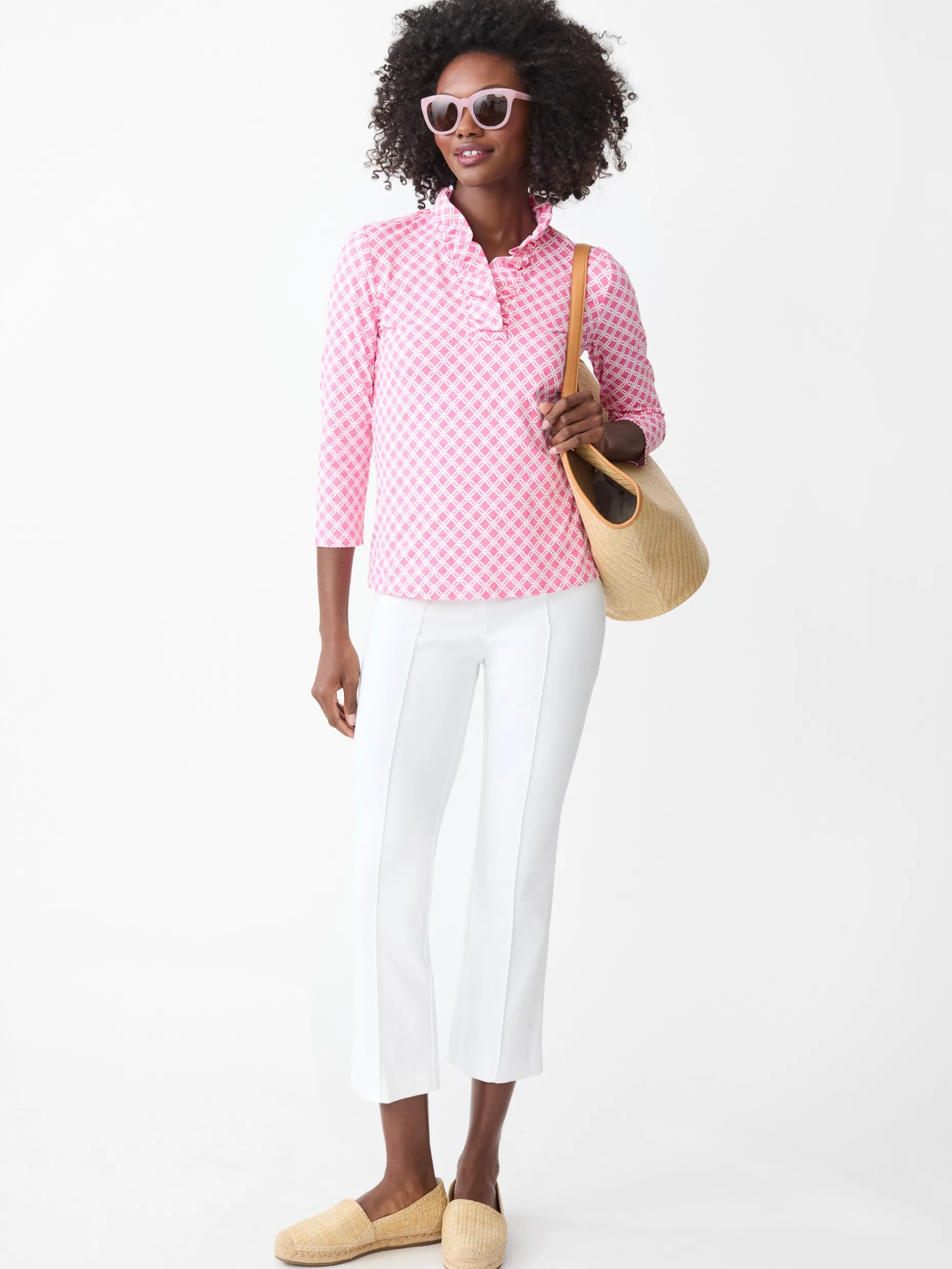 Our top stands out with a face-framing ruffled neckline and comes in our most packable fabric.