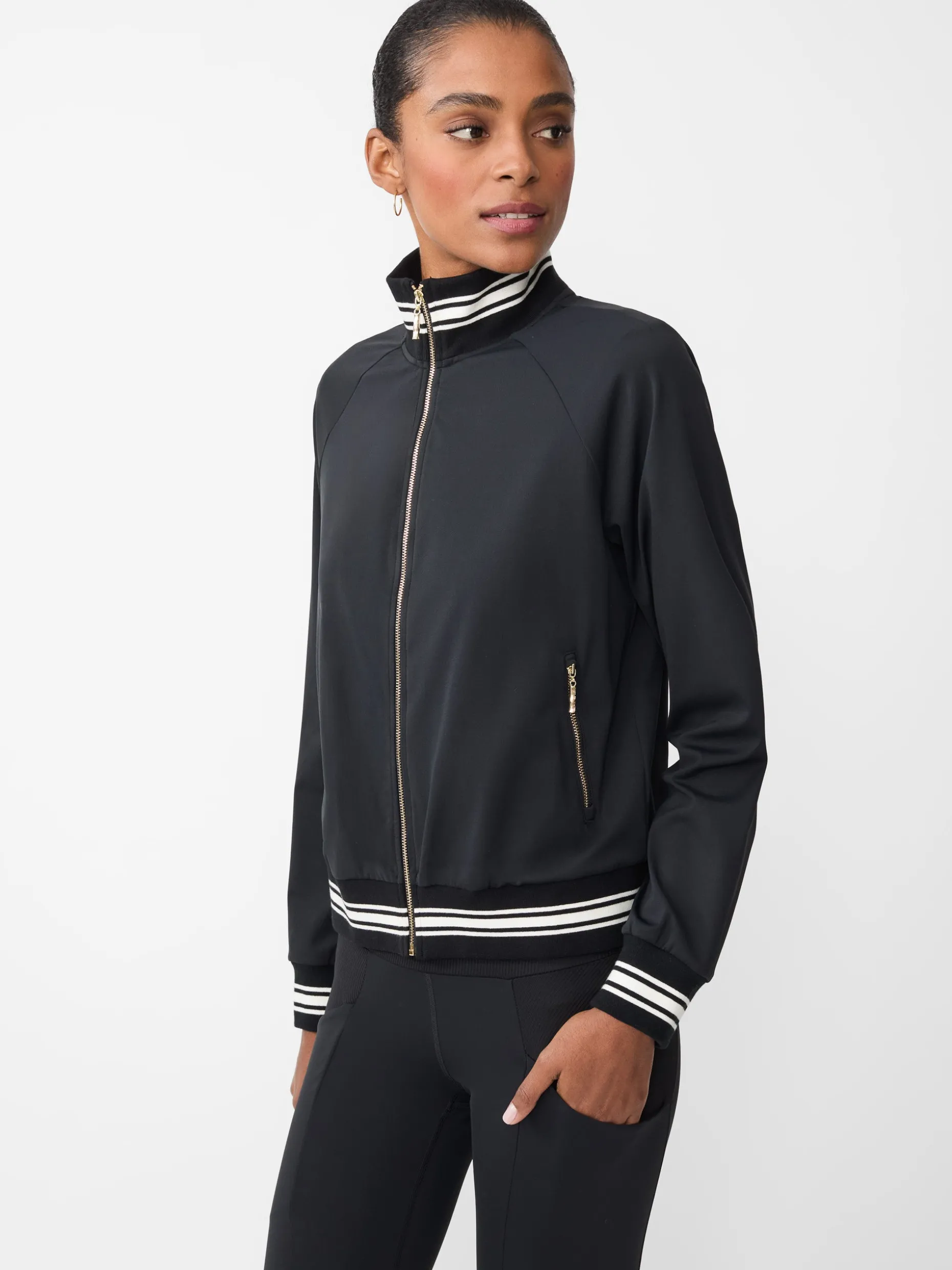 Designed with form and function in mind, Elettra is the ultimate athletic jacket. Details like contrast ribbing and bamboo-style zipper pulls elevate the athleisure silhouette, while the sweat-wicking and quick-drying fabric ensure you stay cool on the course or the court.