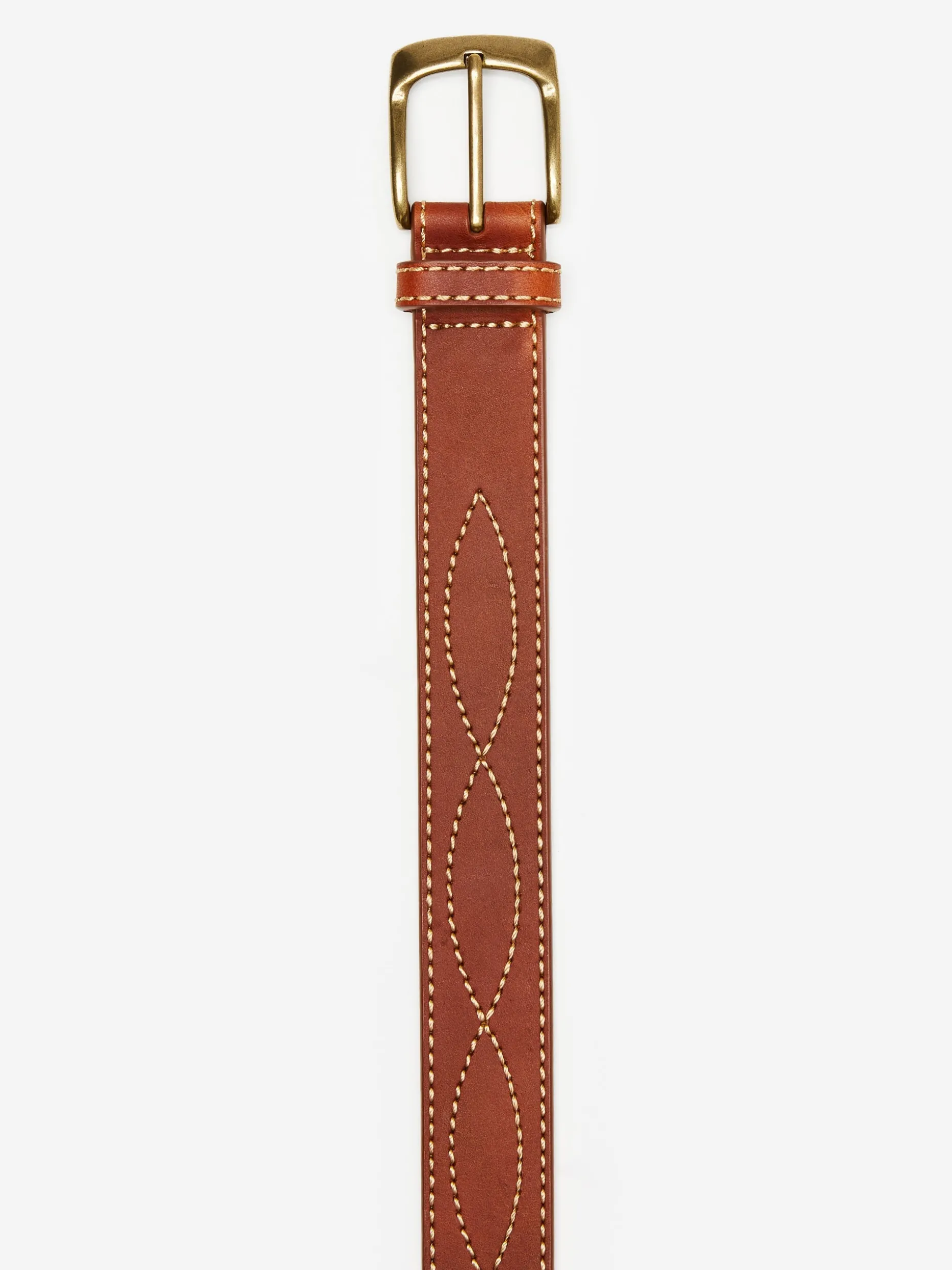 A classic brown leather belt is a staple in any man’s wardrobe, and this one’s brass buckle and intricate embroidery are sure to turn heads.
