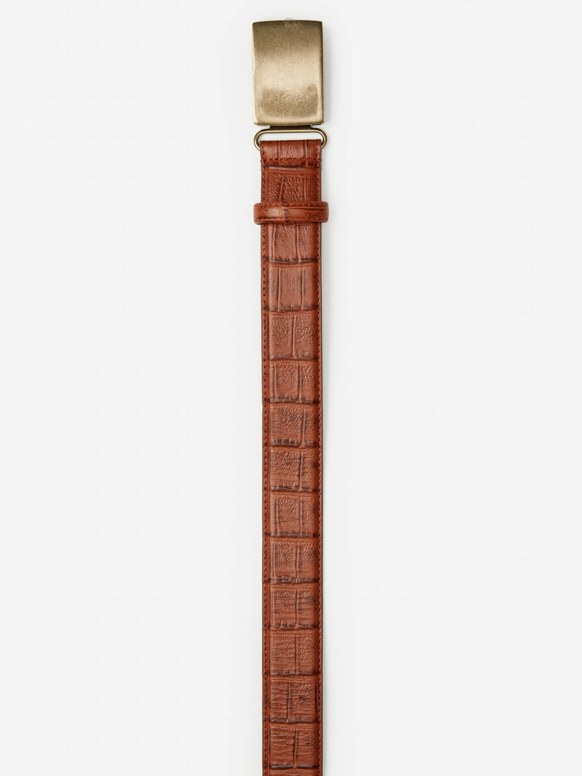 A casual belt with plenty of swagger that you’ll probably want to pair with jeans. Features an antiqued brass buckle. No reptiles were involved here – the croc pattern is embossed onto cow leather.