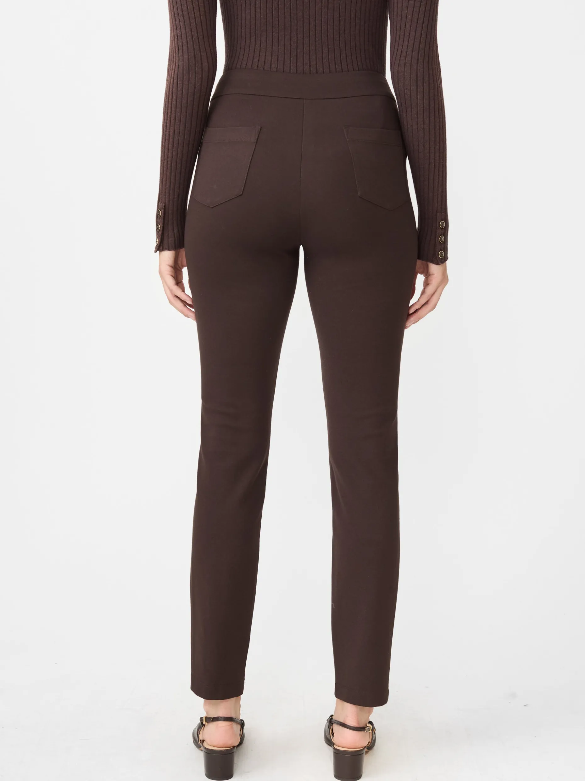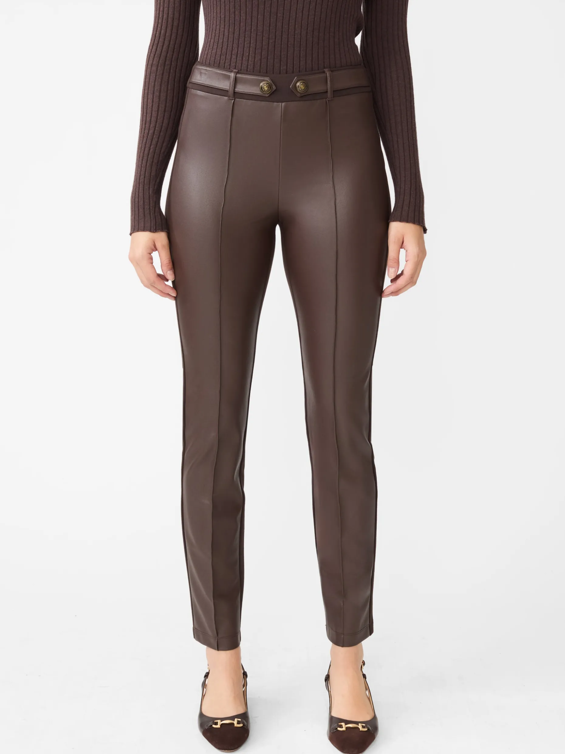 A statement pant with softness and stretch: the Jules legging, featuring pintucked faux-leather at the front, with our matte Bainbridge Cloth at the back.
