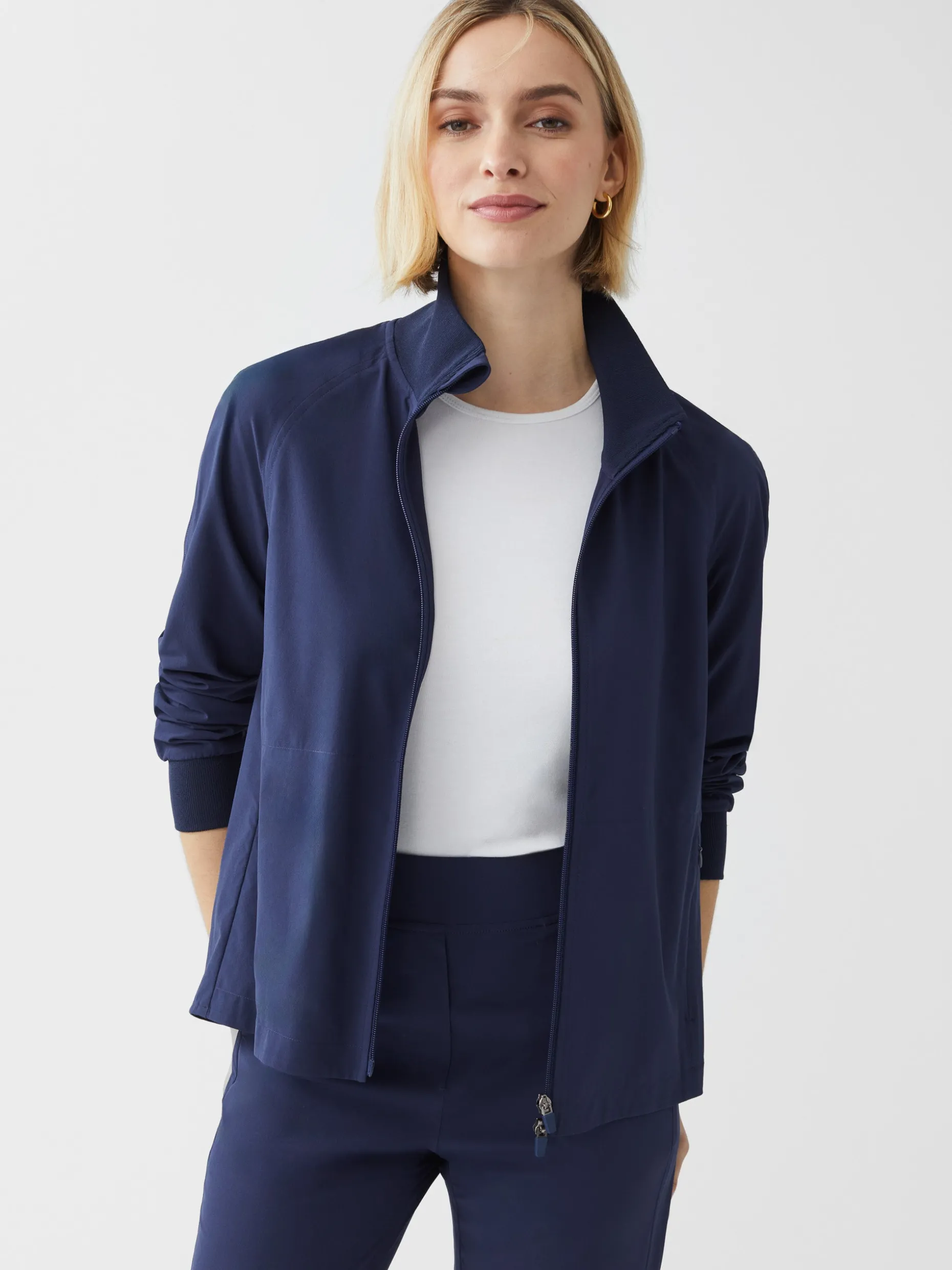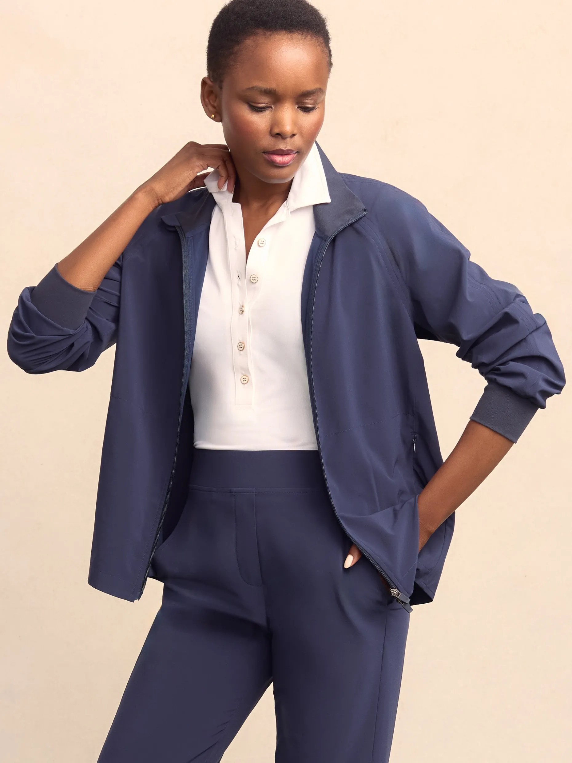 The summer top layer. Mikaela is the lightweight jacket you grab for a morning walk or a chilly afternoon on the golf course. Make it a set with the matching Beasley Pants.