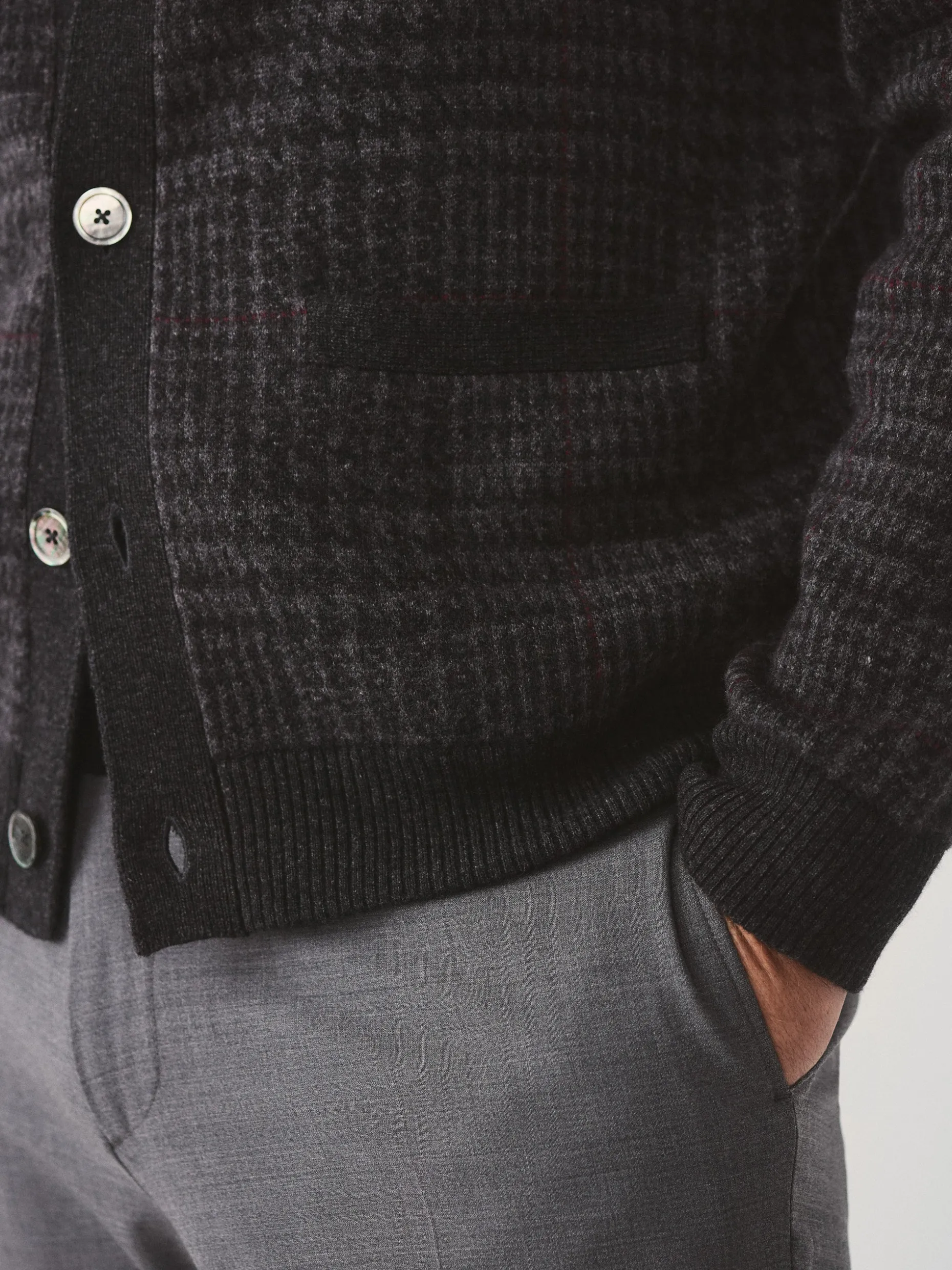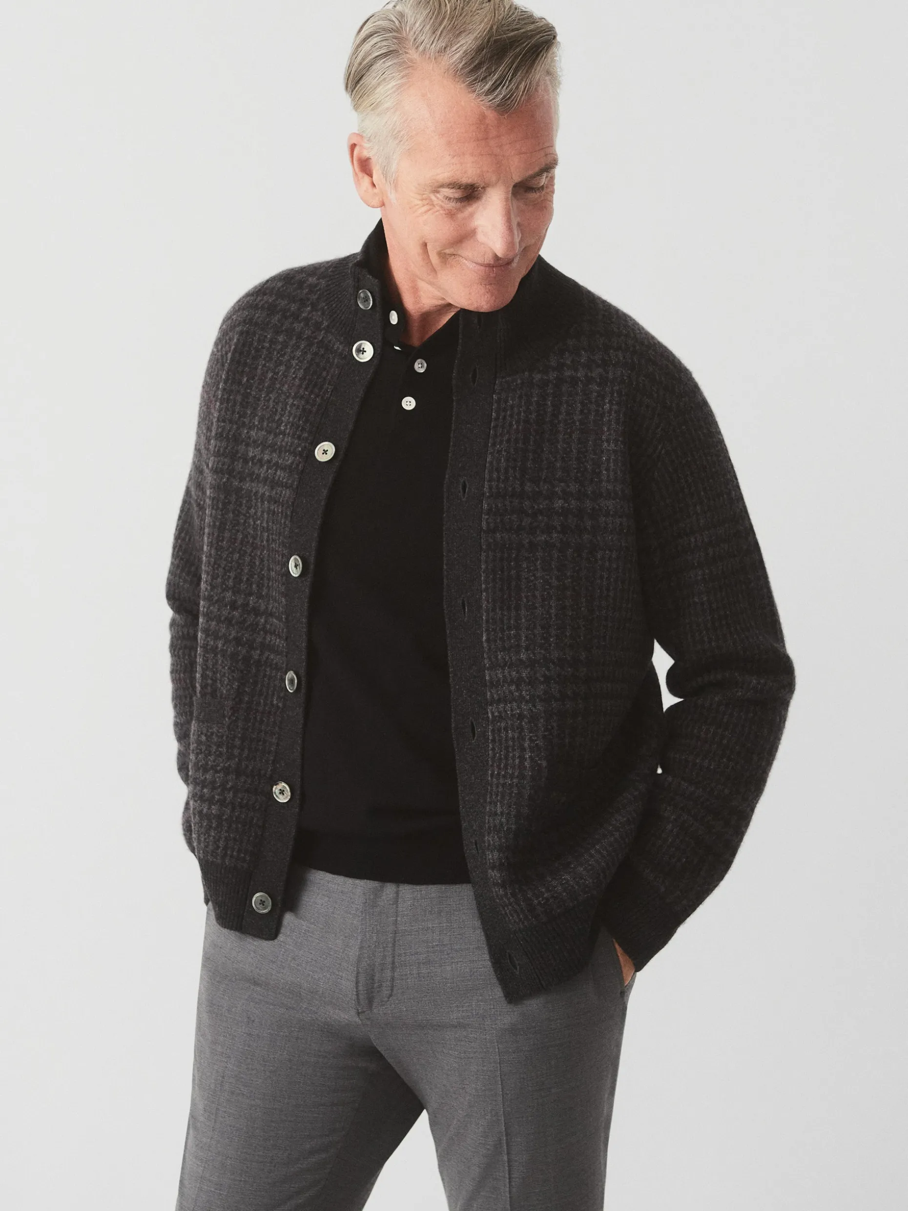 A lofty cashmere mock neck cardigan in a classic Prince of Wales check- easily dressed up or down.