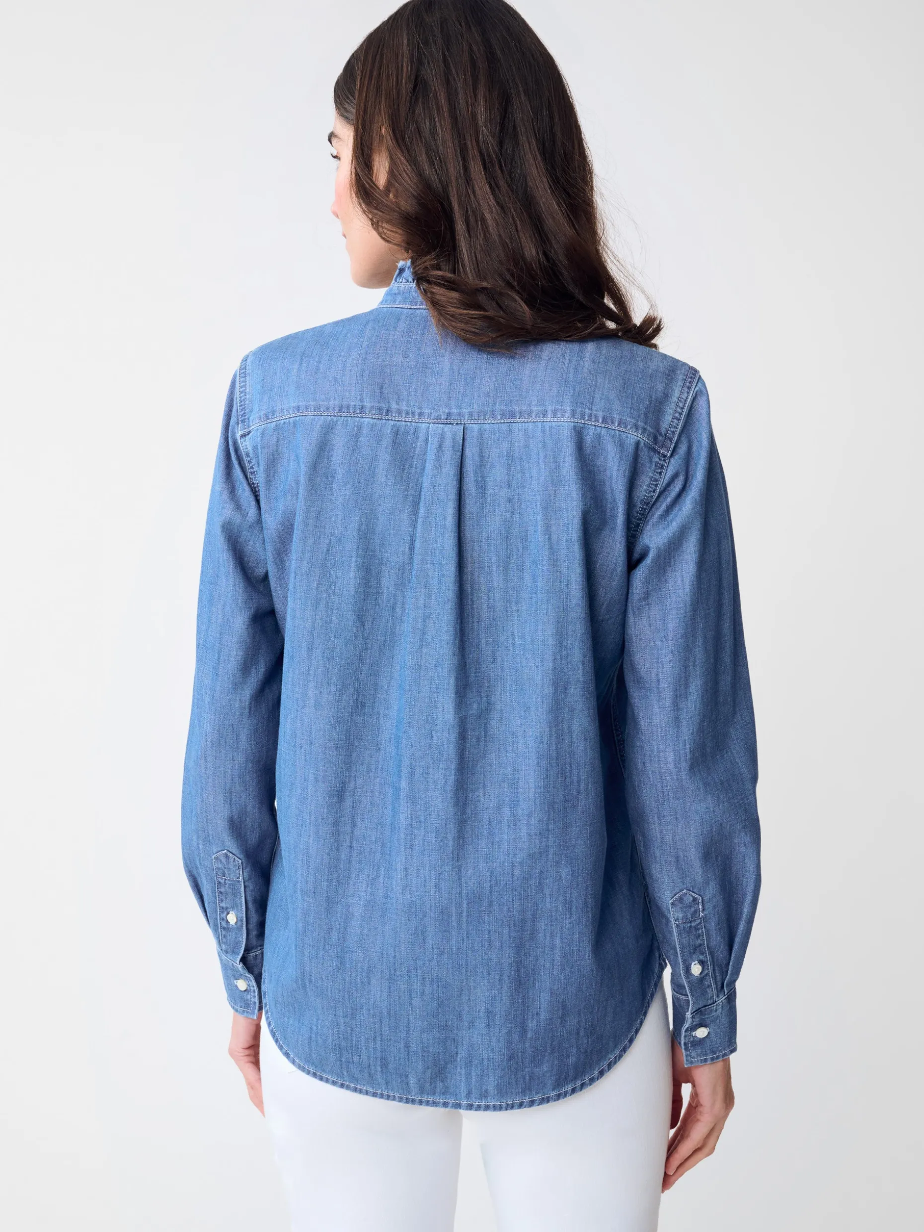 Classic yet fresh, a denim blouse is a wardrobe mainstay. The Rutherford features ruffled collar for a feminine twist.