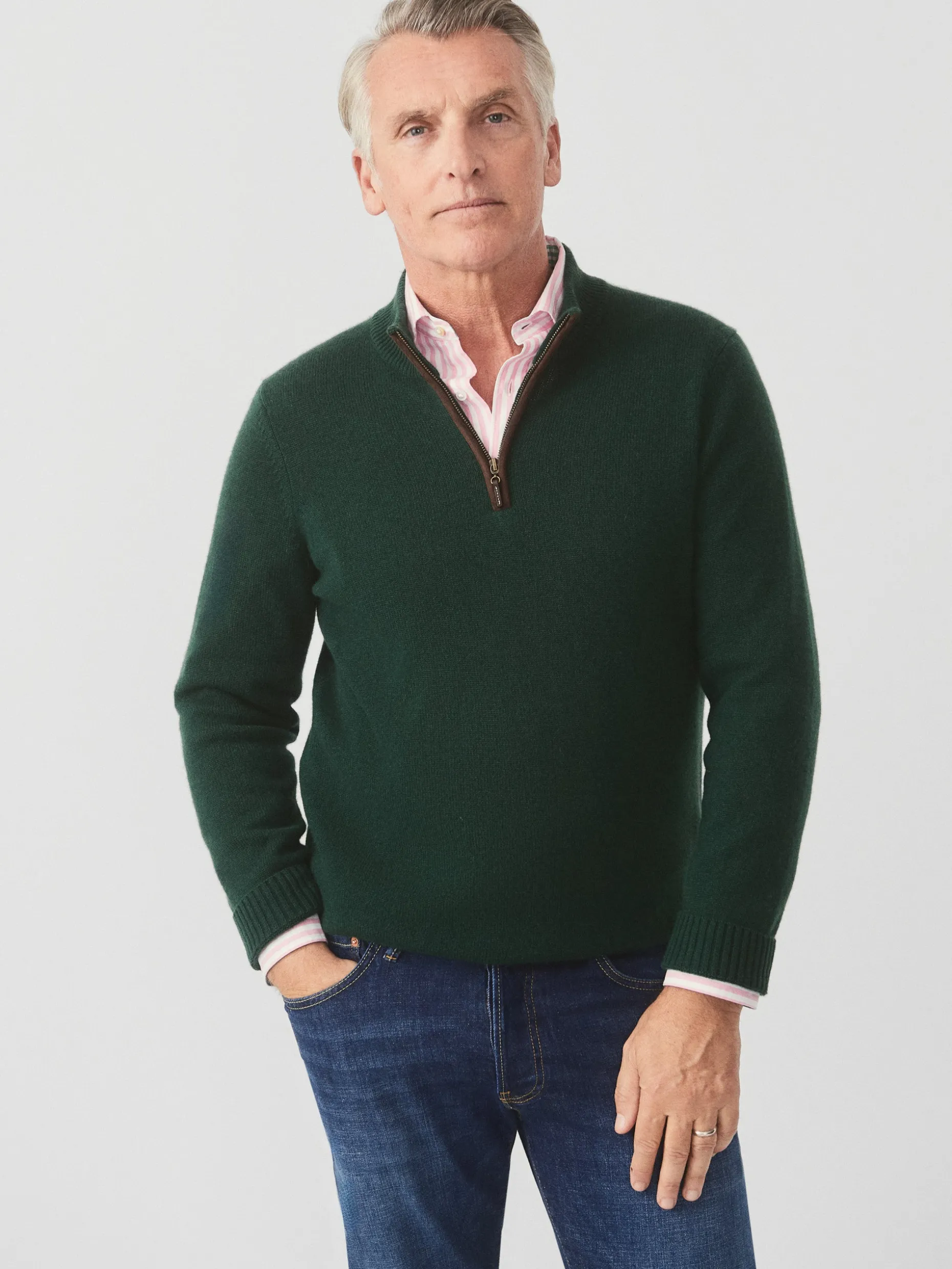 There is a reason why cashmere is often referred to as spun gold. It is just that luxurious and just that enduring. Add to that a classic half-zip silhouette detailed with rich brown suede and you have modern elegance at its nonchalant best.