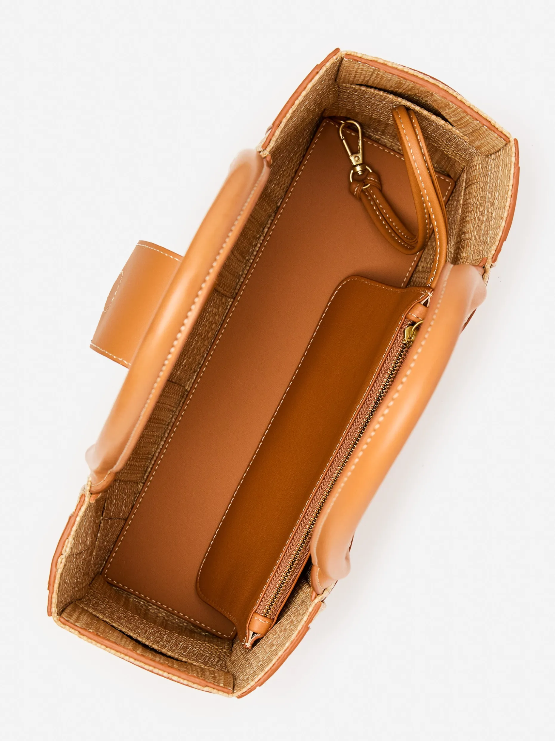 Elevate your look with our latest tote in unexpected leather and raffia basket weave. This bag begs to be seen — whether it’s at the office or out to drinks on the Upper East Side, you two will turn heads everywhere you go.